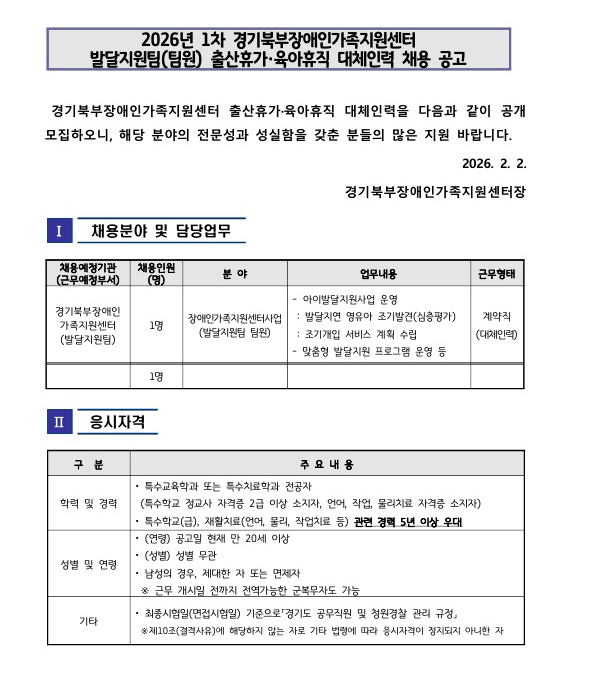 2026년 1차 경기북부장애인가족지원센터 발달지원팀(팀원) 출산휴가·육아휴직 대체인력 채용 공고