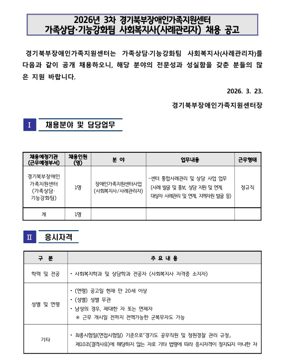2026년 3차 경기북부장애인가족지원센터 가족상담·기능강화팀 사회복지사(사례관리자) 채용 공고