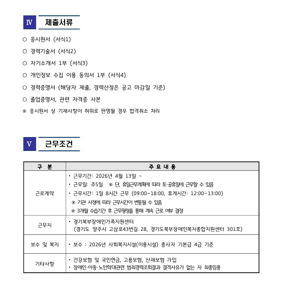 2026년 1차 경기북부장애인가족지원센터 발달지원팀(팀원) 출산휴가·육아휴직 대체인력 채용 공고